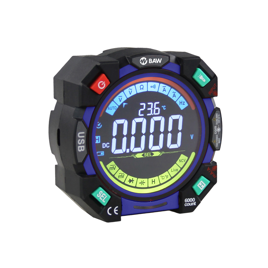 Multímetro digital True RMS Modo automático con selección de rango Pantalla LCD retroiluminada de diseño innovador Carcasa resistente con soporte retráctil para trabajo en banco Linterna incorporada Batería de litio recargable de larga duración Carga mediante USB tipo C con indicador LED de carga completa Auto apagado luego de 15 minutos de inactividad